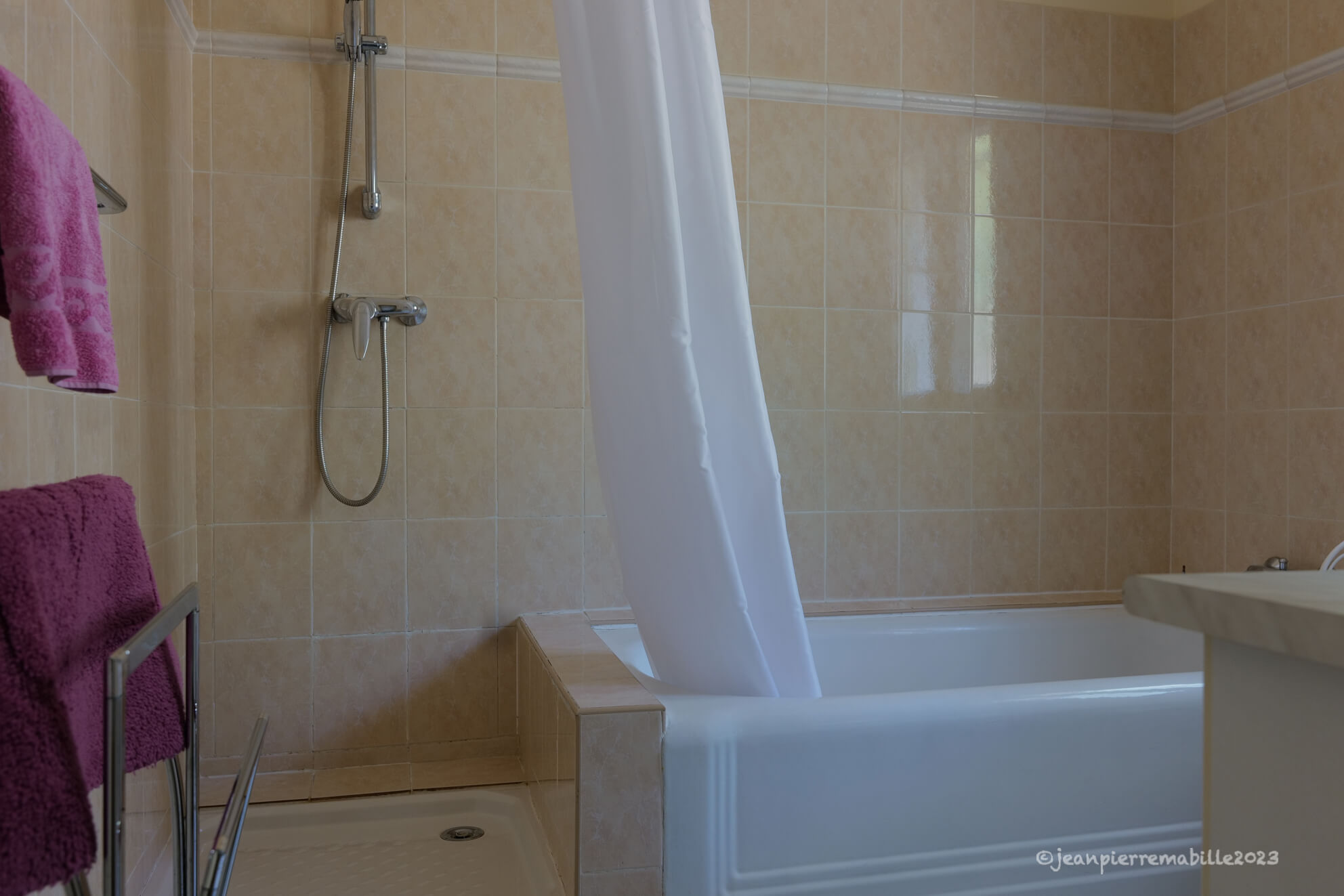• Salle de bain avec lavabo, douche, baignoire.